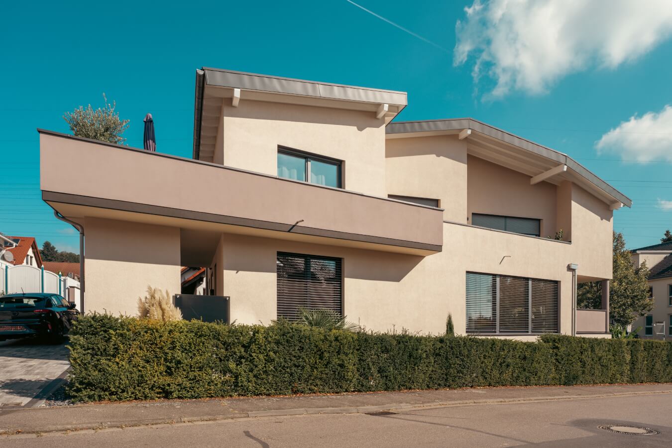 In Kleinostheim entstand ein modernes Zweifamilienhaus, das trotz schmalem Baufenster eine effiziente und ästhetische Architektur vereint. Das Bauvorhaben Wenzel zeigt, wie zeitgemäßes Wohnen auch auf begrenztem Raum optimal realisiert werden kann.